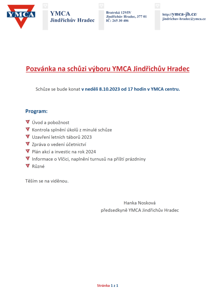 se bude konat v neděli 8.10.2023 od 17 hodin v YMCA centru. Výboru můžete do té doby doručit své podněty k projednání, nápady, připomínky, pochvaly 😉 …