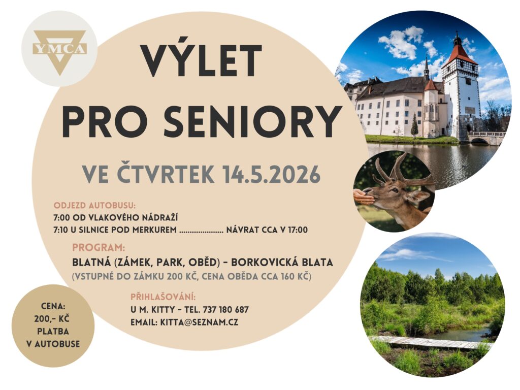 Ve čtvrtek 14. května pořádáme Výlet pro seniory. Pojedeme do Blatné – v plánu je komentovaná prohlídka zámku, procházka po zámeckém parku, společný oběd v restauraci a posezení v zámecké kavárně. Cestou zpět se zastavíme na Borkovických blatech. Tempo bude celý den přizpůsobeno potřebám účastníků. Stejně tak i body programu – můžete se zúčastnit jen některých částí. Odjezd autobusu v 7 hodin od vlakového nádraží, v 7.10 možnost nastoupit i u silnice pod Merkurem. Návrat kolem 17. hodiny. Cena zájezdu je 200 korun – platba v autobuse. Další případné výdaje: 250 Kč vstup do zámku a parku, oběd za cca 160 Kč. Přihlašování na tel. 737 180 687. Těšíme se na společné zážitky!