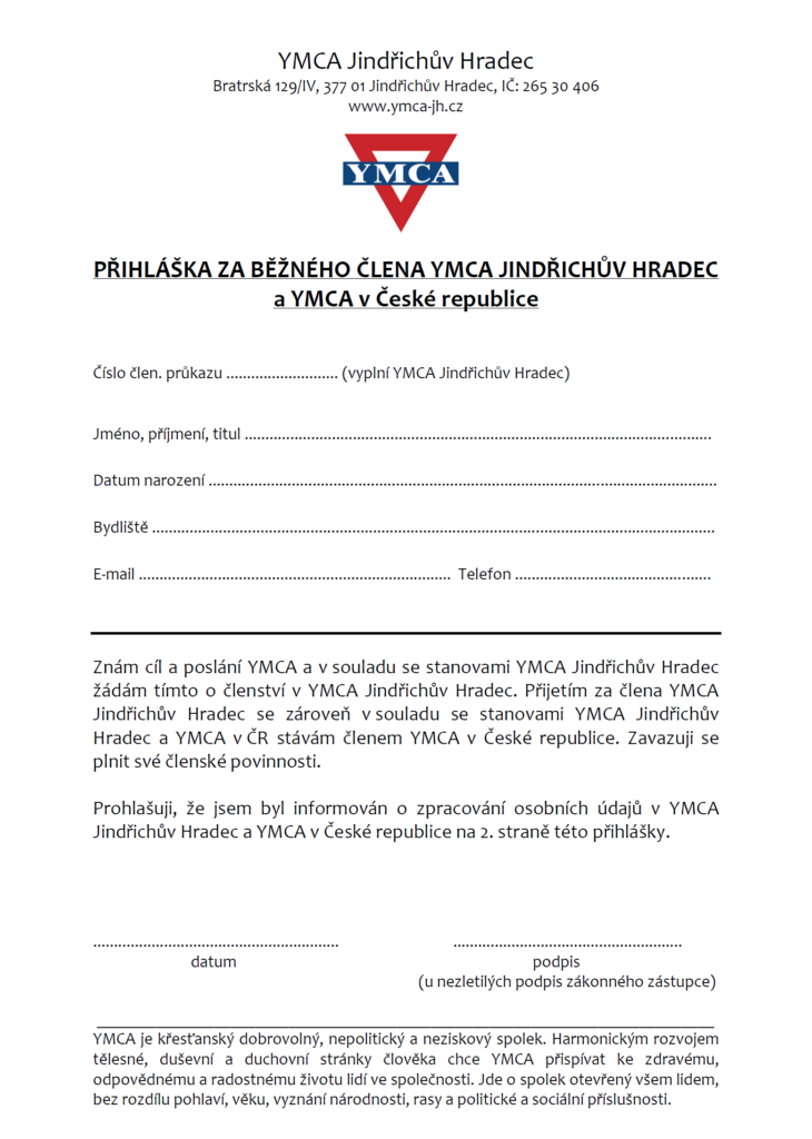 Zveme vás k členství v YMCA. Pokud ještě nejste členy YMCA, zvažte, zda byste se chtěli do YMCA přihlásit. Členství v YMCA má spoustu výhod!